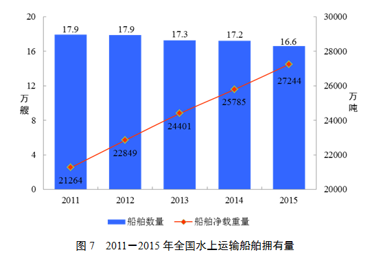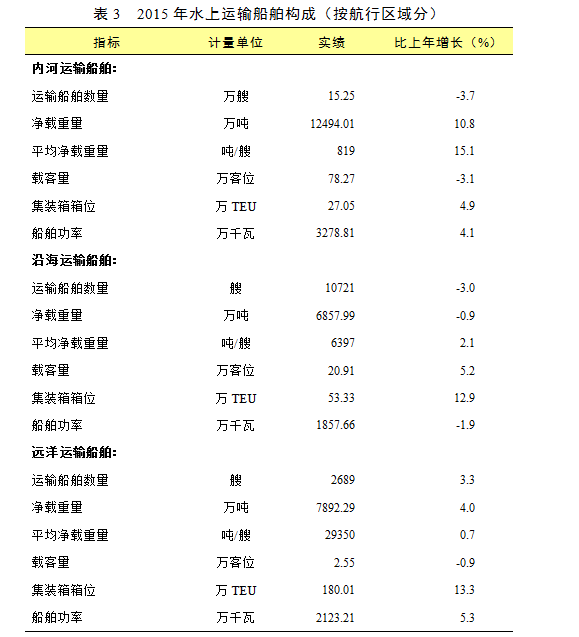 年末全国拥有水上运输船舶16.59万艘,比上年末减少3.5%;净载重量27244.29万吨,增长5.7%;平均净载重量1642.16吨/艘,增长9.5%;载客量101.73万客位,减少1.5%;集装箱箱位260.40万TEU,增长12.3%;船舶功率7259.68万千瓦,增长2.8%。