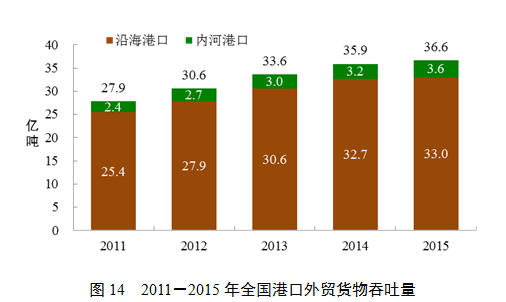 全国港口完成外贸货物吞吐量36.64亿吨,比上年增长2.0%。其中,沿海港口完成33.01亿吨,内河港口完成3.63亿吨,分别增长1.0%和12.2%。