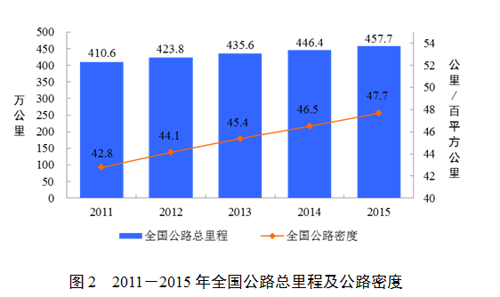 年末全国公路总里程457.73万公里,比上年末增加11.34万公里。公路密度47.68公里/百平方公里,提高1.18公里/百平方公里。公路养护里程446.56万公里,占公路总里程97.6%。