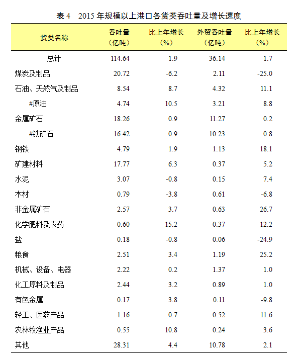 全国规模以上港口完成货物吞吐量114.64亿吨,比上年增长1.9%。其中,完成煤炭及制品吞吐量20.72亿吨,石油、天然气及制品吞吐量8.54亿吨,金属矿石吞吐量18.26亿吨,分别下降6.2%、增长8.7%和0.9%。