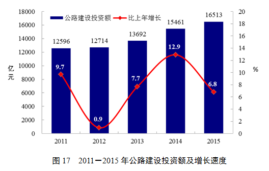 全年完成公路建设投资16513.30亿元,比上年增长6.8%。其中,高速公路建设完成投资7949.97亿元,增长1.7%。普通国省道建设完成投资5336.07亿元,增长15.7%。农村公路建设完成投资3227.27亿元,增长6.5%,新改建农村公路25.28万公里。纳入《集中连片特困地区交通建设扶贫规划纲要(2011-2020)》的505个贫困县完成公路建设投资3474.72亿元,增长0.9%,占全国公路建设投资21.0%。