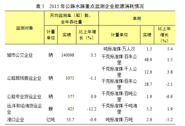 全年共监测公路水路运输企业125家。监测的城市公交企业每万人次单耗1.5吨标准煤,比上年增长5.4%,百车公里单耗48.9千克标准煤,增长1.5%;公路班线客运企业每千人公里单耗12.6千克标准煤,增长3.8%,百车公里单耗28.7千克标准煤,下降2.1%;公路专业货运企业每百吨公里单耗1.9千克标准煤,下降6.9%;远洋和沿海货运企业每千吨海里单耗5.2千克标准煤,增长1.9%;港口企业每万吨单耗2.6吨标准煤,下降5.2%。