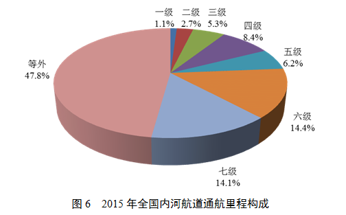 各等级内河航道通航里程分别为:一级航道1341公里,二级航道3443公里,三级航道6760公里,四级航道10682公里,五级航道7862公里,六级航道18277公里,七级航道17891公里。等外航道6.07万公里。