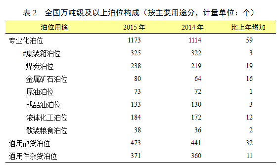 全国万吨级及以上泊位中,专业化泊位1173个,通用散货泊位473个,通用件杂货泊位371个,比上年末分别增加59个、32个和11个。