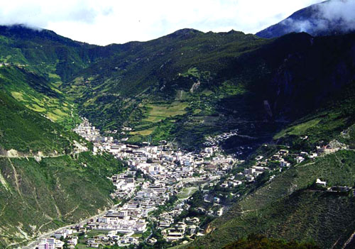 镇里房屋依山建筑,难得觅到一块篮球场大的平地。县政府礼堂是推了半边山才建成的。礼堂前的一块平地是全城最热闹的中心。半山上是县政府招待所。新城区沿山谷修下,只有两条主要街道,有铜器首饰厂、纺织厂等小作坊及邮局、商店、小吃铺等。老城区的石板路和藏式商铺民居至今犹存,过去由于过往客商多,当地居民主要靠出租房子,店铺为生。沿老城区小街转悠一下,客栈、马店及依然出售的山货特产、马鞍、皮革及农用铁器那种古老的气氛使人还能感受到它昔日曾有的热闹和繁华。