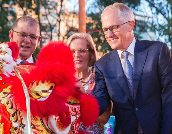 在澳大利亚悉尼,澳大利亚总理特恩布尔(右)为舞狮点睛。(新华社记者 朱宏业 摄)