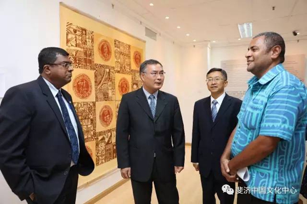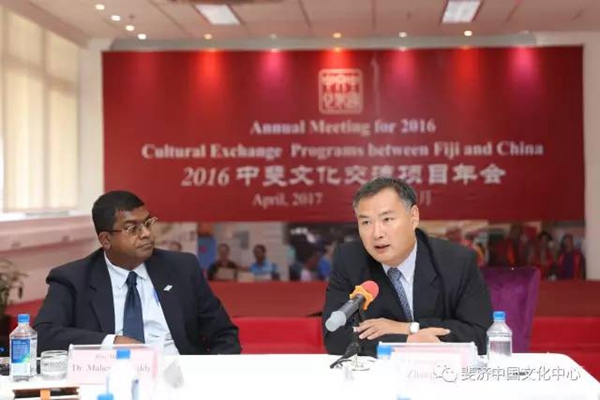 4月10日,斐济中国文化中心举办“2016中斐文化交流年会”暨斐济艺术家“来华创作”作品展。中国驻斐济大使张平,斐济教育、遗产与艺术部部长马亨德拉·雷迪,斐济教育、遗产与艺术部常务秘书蒂科(副部长),遗产艺术司司长科林·亚巴克,斐济中国文化中心主任邓先富等出席。来自斐济艺术委员会、斐济博物馆、南太平洋大学大洋洲艺术中心、孔子学院等单位代表以及斐济太阳报,斐济时报,斐济电视台(FJTV),斐济广播公司(FBC)等新闻单位媒体记者70余人参加。张平大使、马亨德拉·雷迪部长、邓先富主任分别致辞。