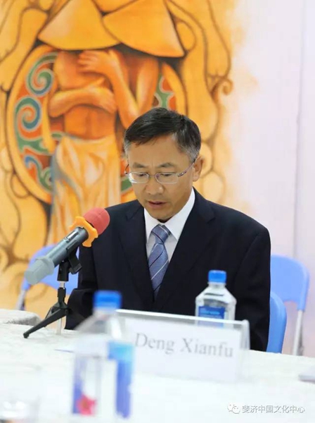 张平大使表示,中国政府倡导的“一带一路”构想,不仅有道路、桥梁等“设施联通”,也包含文化交往、人员交流等“民心相通”项目。希望双方充分抓住“一带一路”带来的机遇,积极投身中斐文化交流与合作,集思广益、开拓创新,共同开创两国人文交往的美好明天。
