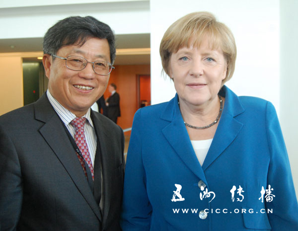 德国总理默克尔国际德国论坛上与中国改革发展研究院院长迟福林合影。危文锋摄(中国日报网)