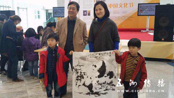 11月15日是“艺术日”,别开生面的“中韩艺术家交流”活动在本届文化节现场引发了热潮,画家张伟、书法家廋石、书法家王永江与三位韩国画家同台创作,互赠作品,交流切磋。廋石先生的书法章法谨严、古风犹存,求墨宝者络绎不绝;张伟先生画的水墨熊猫形神兼备、妙趣天成,成为小朋友们的最爱;最后,数十人手捧20米长卷宣纸,由中国老子文化促进会会长王永江先生当场表演《临江仙·滚滚长江东逝水》行草书法,则掀起当天活动的高潮。
