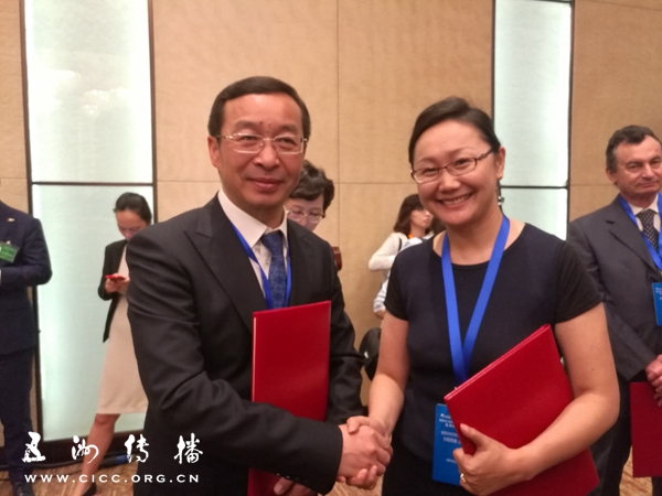 五洲传播中心主任陈陆军与蒙古国NTV电视台节目部总监辛琪琪格·杰戈尔赛罕签订备忘录