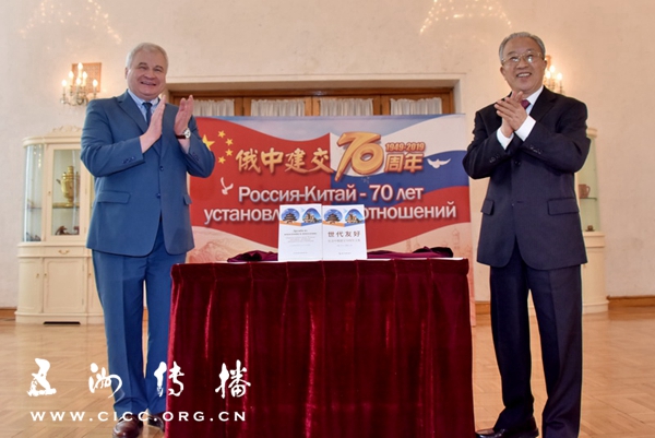 5月25日,在中俄建交70周年、两国元首即将再次实现互访之际,由中俄友好、和平与发展委员会老朋友理事会组织编写、五洲传播出版社出版的《世代友好——纪念中俄建交70周年文集》中、俄文版在俄罗斯驻华使馆首发。中俄友好、和平与发展委员会主席戴秉国和俄罗斯驻华大使杰尼索夫为新书揭幕。外交部副部长乐玉成、俄罗斯驻华大使杰尼索夫、五洲传播出版社社长陈陆军致辞。外交部原常务副部长田曾佩、国家发改委原副主任张国宝、原新闻出版总署副署长李东东、中联部原副部长周力和中俄双方老朋友等120多人出席。