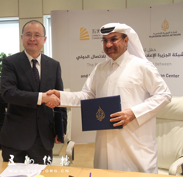 半岛电视台全球品牌与传播执行董事阿卜杜拉·阿尔·纳贾尔与五洲传播中心副主任副总编辑井水清签署合作备忘录