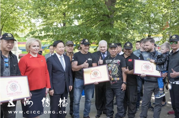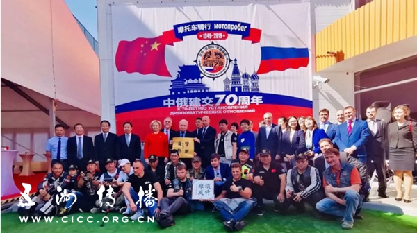6月4日下午,“友谊之路”2019中俄联合摩托车骑行活动闭幕式在莫斯科索科利尼基会展中心举行。中宣部常务副部长王晓晖,俄罗斯驻华大使杰尼索夫,俄罗斯国家杜马议员、教育和科学委员会副主席杜哈尼娜等会见了长途跋涉近9000公里的40多名中俄骑行勇士代表,并为他们授牌。