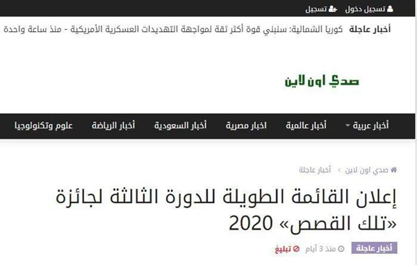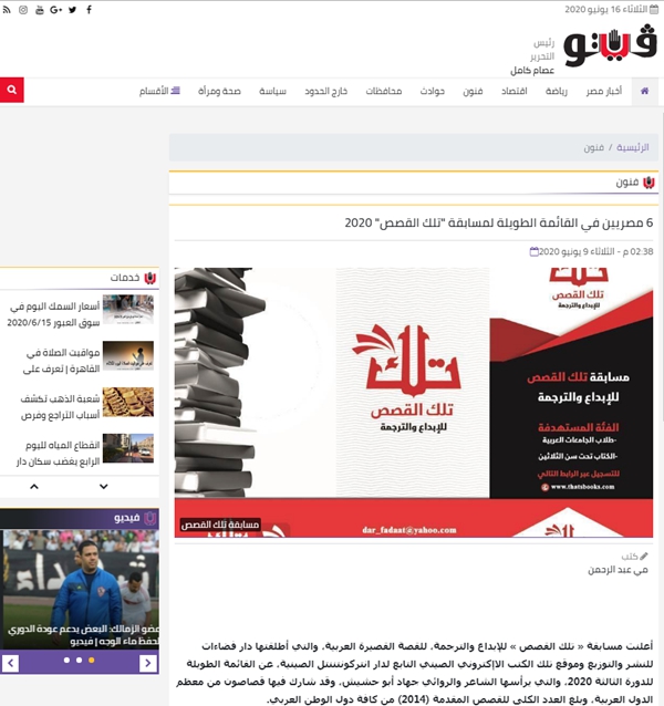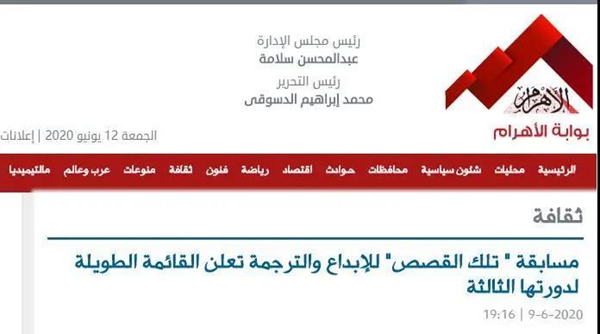2020年4月至6月,由中国五洲传播出版社和约旦空间出版社联合举办的第三届that’s books阿拉伯网络小说创作大赛(以下简称:创作大赛)正在进行紧张的评选环节。此次比赛受到众多阿拉伯主流媒体的关注。6月1日,创作大赛公布长名单,先后有包括埃及《金字塔报》、约旦《宪法报》、埃及Vetogate新闻网、阿尔及利亚《文化》杂志在内的300多家阿拉伯知名网站、报纸和杂志对本届小说创作大赛进行了报道。其中,埃及《金字塔报》日发行量为110万份,是阿拉伯国家中创办最早的报纸,也是世界上最早出现的报纸之一。