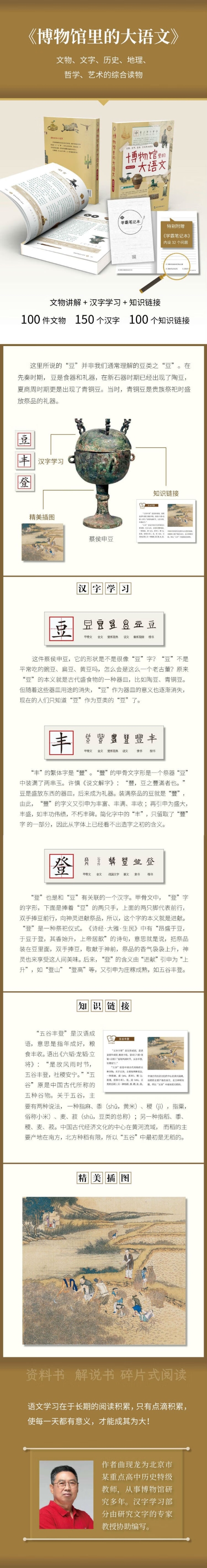 文物承载着历史的记忆和文化积淀,每件文物背后都有鲜活的“人”与“事”。文字是文明传递的载体、民族延续的基因。研究文字演化的历程,就是研究文明产生、发展的密码。文字研究也是砸实中小学生语文功底的最基本的途径。本书精选100件中国文物,在充分挖掘其价值的基础上,由文字说开来,对与文物关联的汉字进行研读,并进一步引申出文物背后的历史文化知识。 来吧,让我们一起走进博物馆,与100件文物,上一堂有趣的语文课!